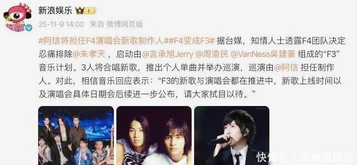 2025年11月9号那天,F4演唱会突然改名叫F3,官方没有多解释,可大家都知道怎么回事,就是朱孝天被踢出去了,起因是他在直播中说话太多,提到他们九年没联系,又说合体是阿信逼的,还说自己因为生病才勉强参加,结果公司非常生气,直接取消了他的资格,鸟巢那场演唱会,他的名字也从海报上去掉了。